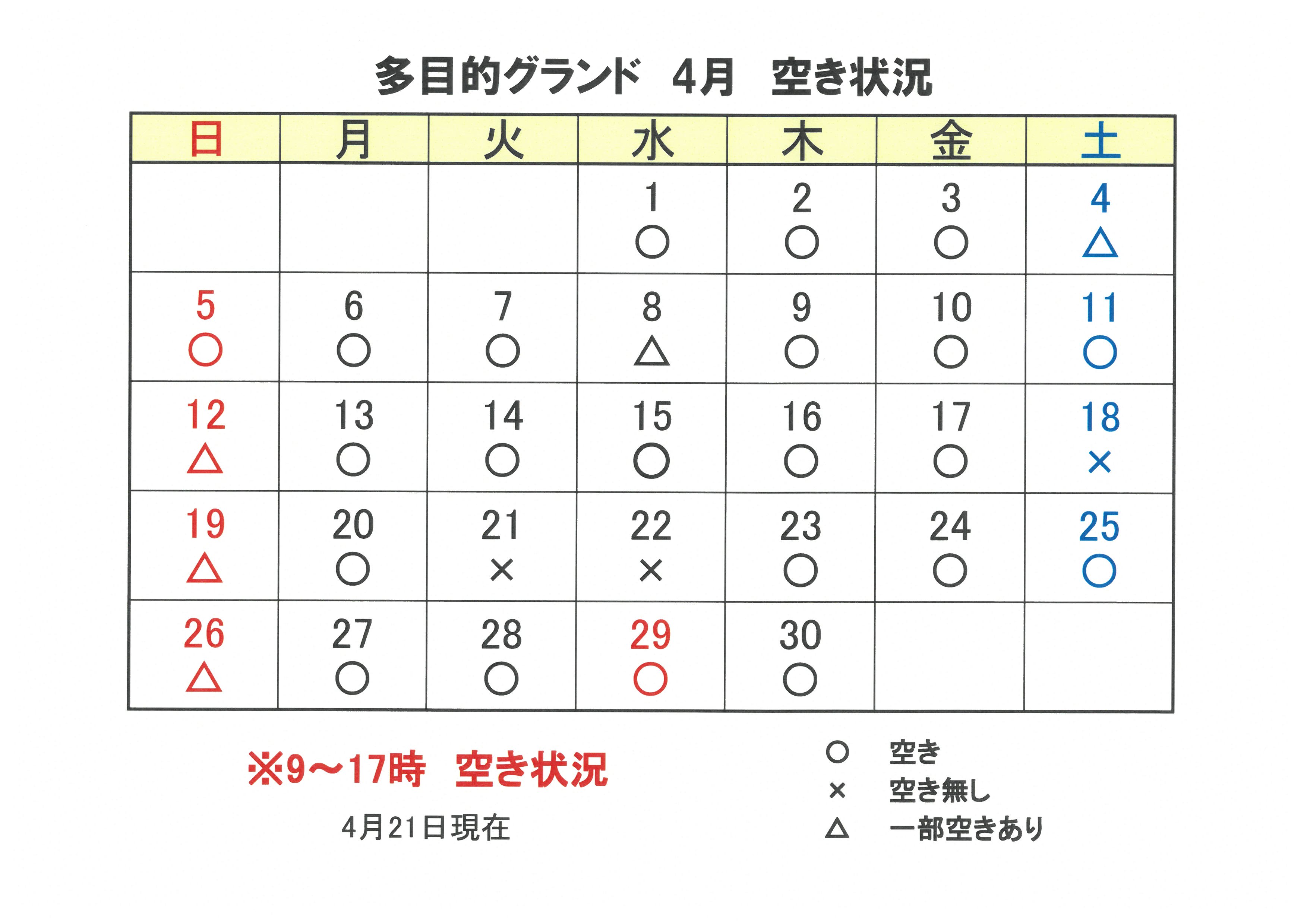 - 4月 磐梯熱海スポーツパーク体育館・多目的グランドの空き状況