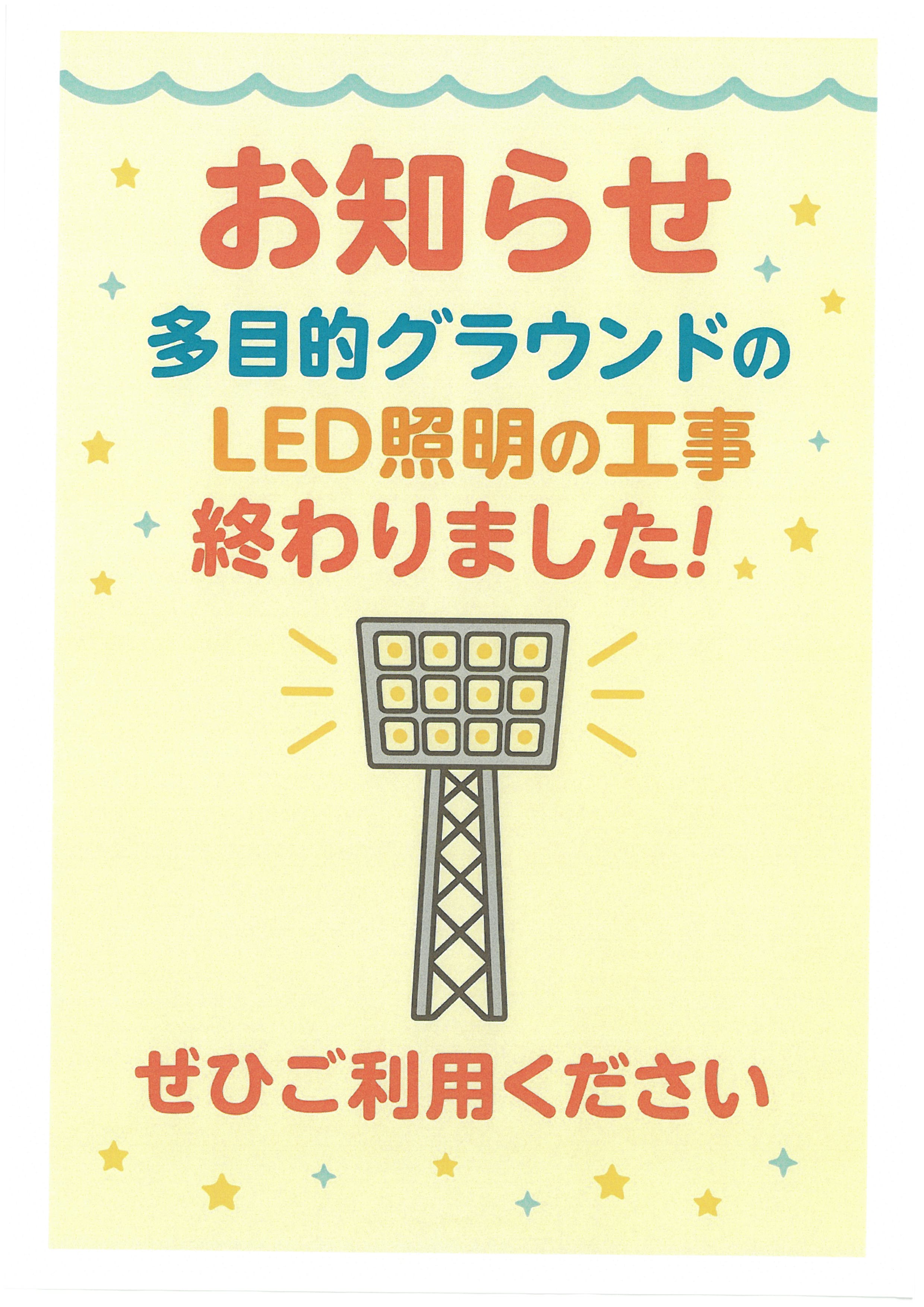 尚、10月より、多目的グランドの照明設備の工事を行う為、当面の間ご利用いただけません。