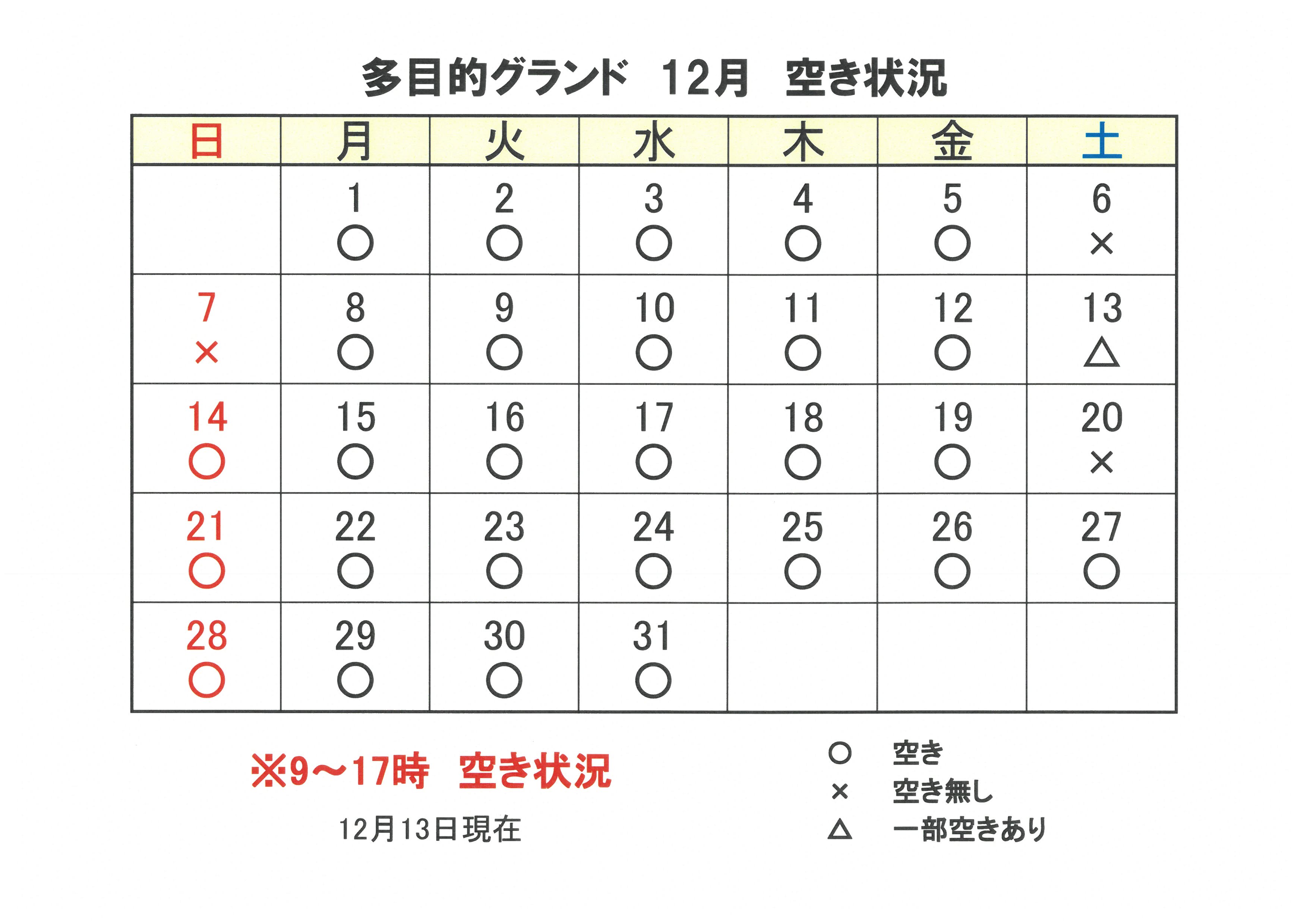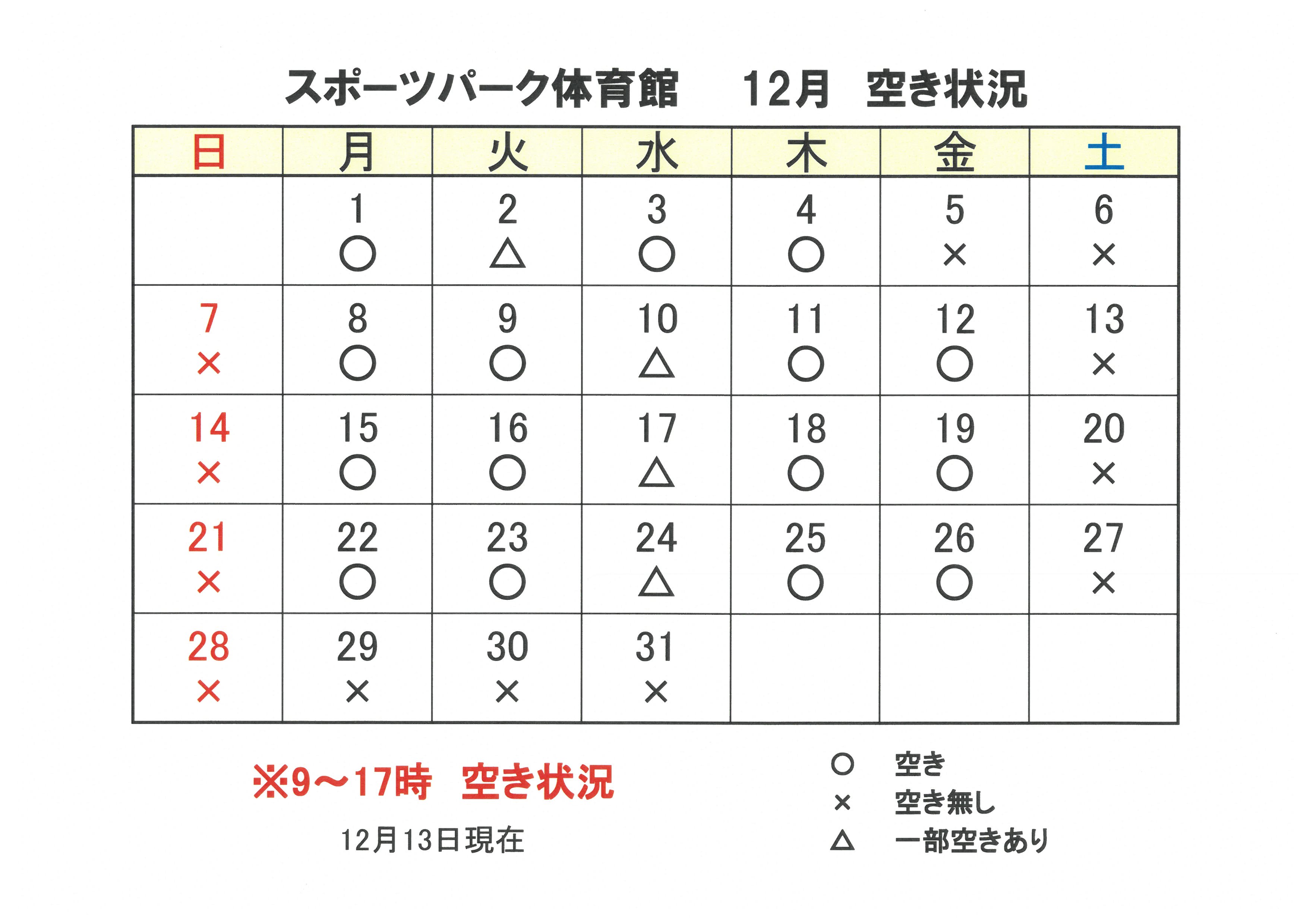 本日12月13日現在の各施設の空き状況は、下記の通りです。