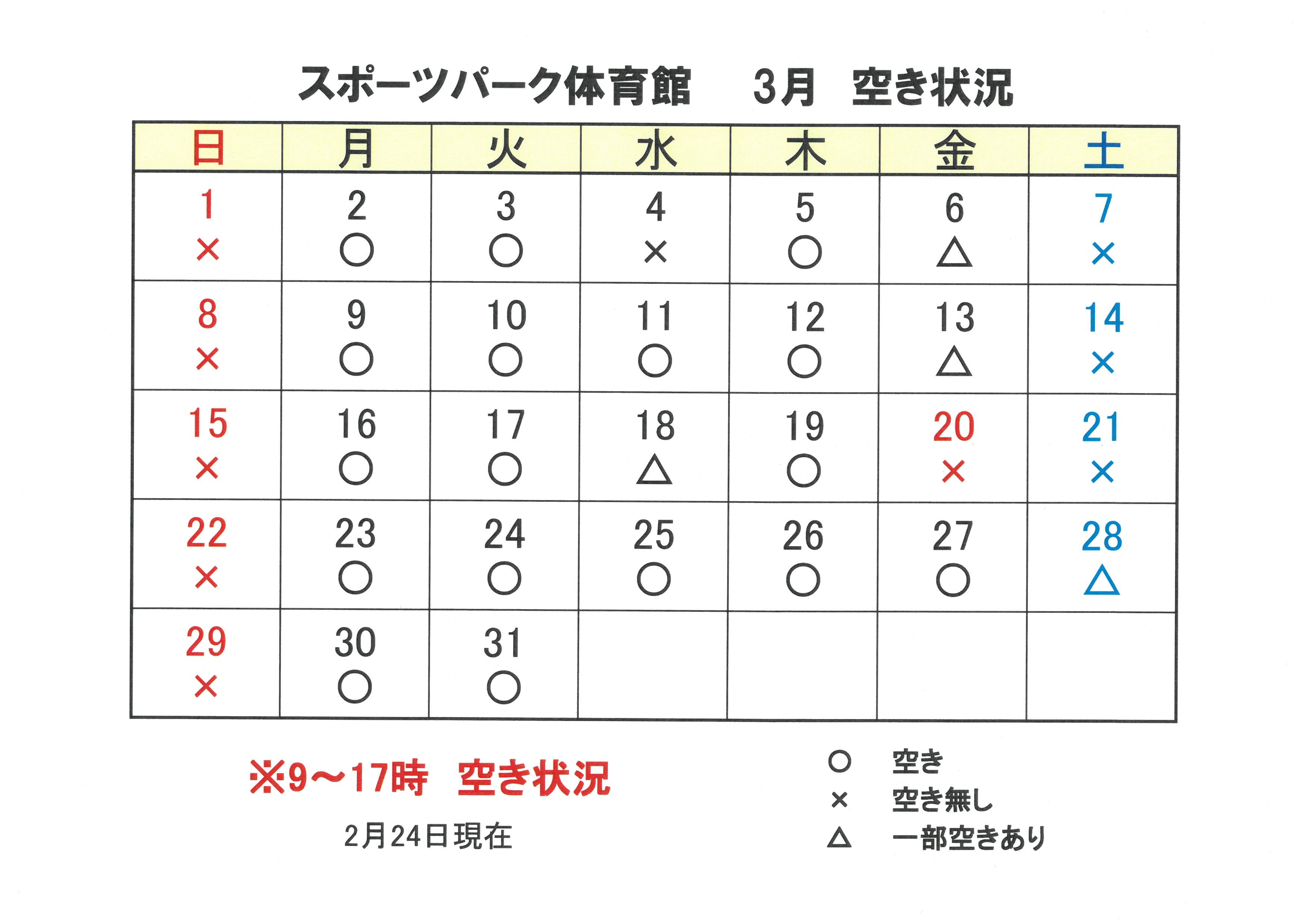 3月磐梯熱海スポーツパーク体育館・多目的グランドの空き状況 3月体育館・多目的グランドの空き状況 いつも磐梯熱海スポーツパークをご利用いただき、誠にありがとうございます。 本日2月24日現在の各施設の空き状況は、下記の通りです。 ご予約はインターネット、またはお電話にて承っております。 皆様のご利用を心よりお待ちしております。 ※予約状況は、随時変動しますのでお気軽にお電話にてお問い合わせください。