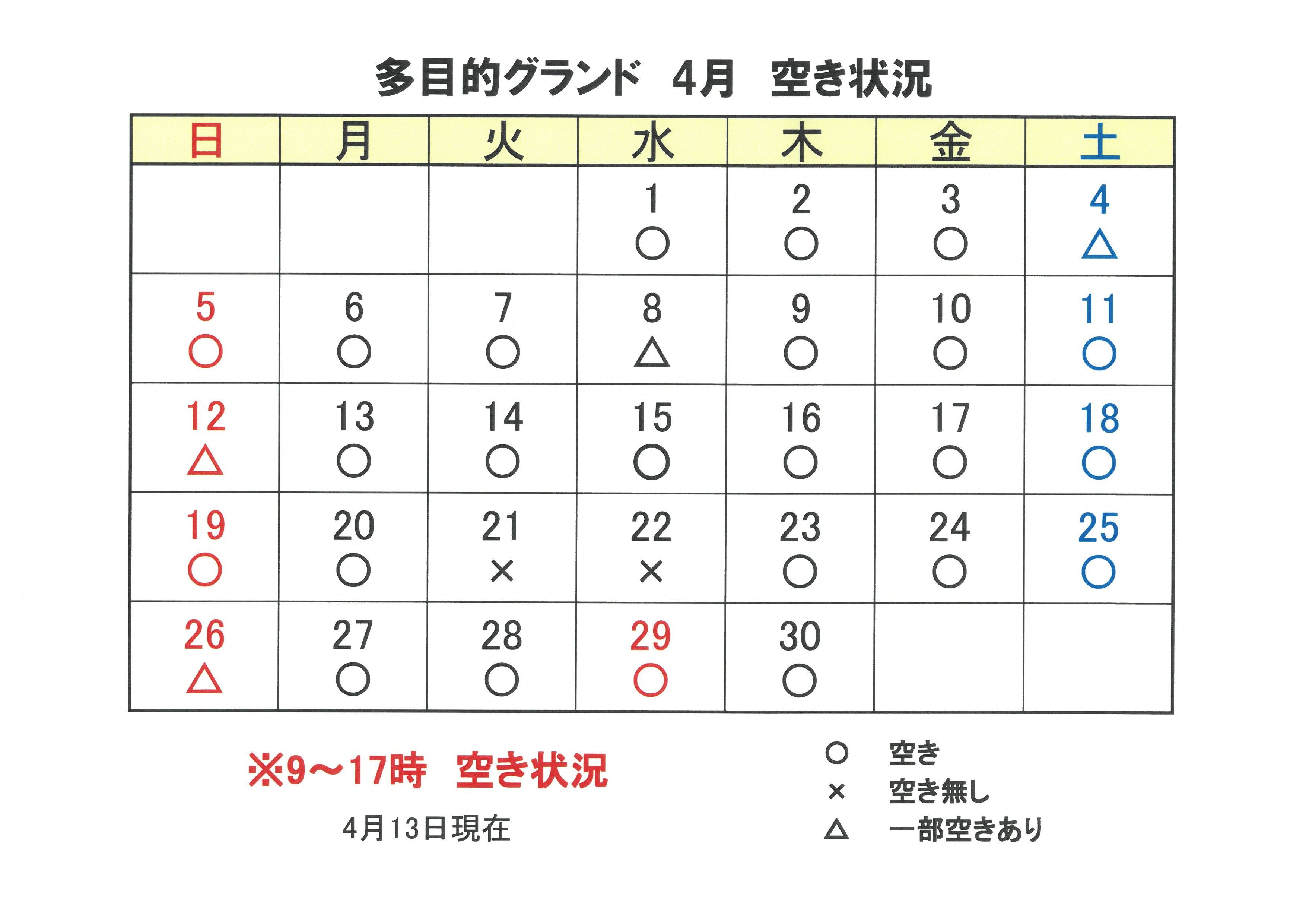4月磐梯熱海スポーツパーク体育館・多目的グランドの空き状況 4月 体育館・多目的グランドの空き状況 いつも磐梯熱海スポーツパークをご利用いただき、誠にありがとうございます。 本日4月13日現在の各施設の空き状況は下記の通りです。 ご予約はインターネット、またはお電話にて承っております。 皆様のご利用を心よりお待ちしております。 ※予約状況は、随時変動しますのでお気軽にお電話にてお問い合わせください。
